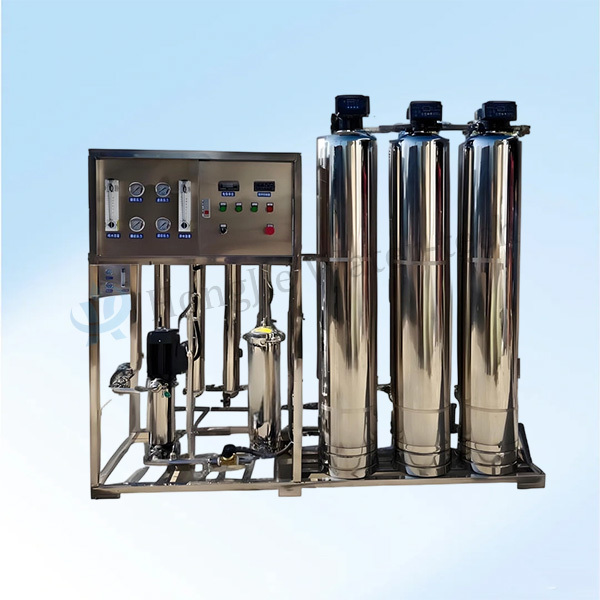 Raw water→raw water pump→mechanical filter (quartz sand filter)→ activated carbon filter→added scale inhibitor→precision filter→RO high-pressure pump→RO reverse osmosis membrane element →finished water